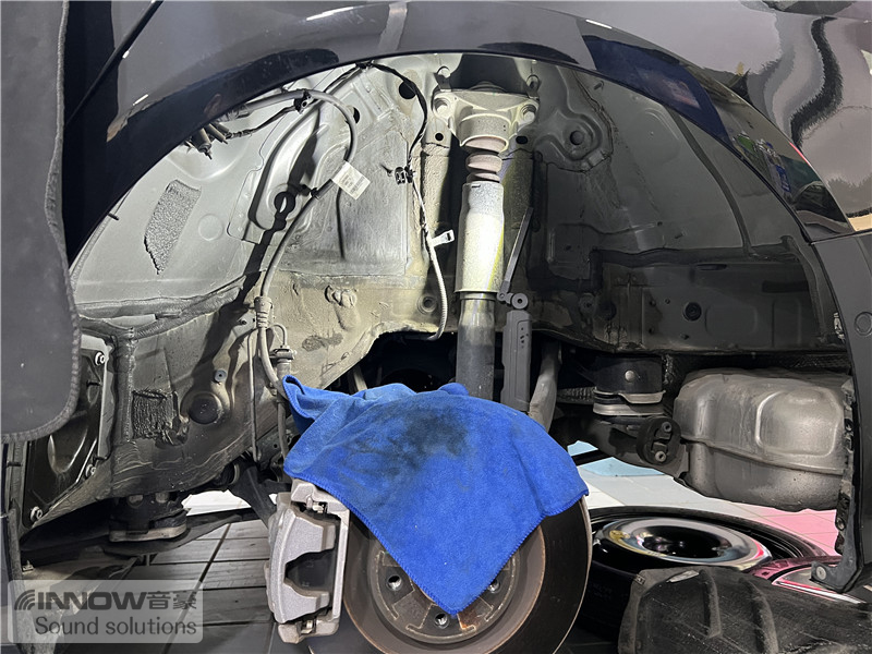 轮胎与地面摩擦会产生路噪和胎噪,此类噪声主要通过四轮翼子板传入到车厢内部。所以技师先使用欧尊止震板对四轮翼子板做了止振处理,这既可以减少空腔共鸣的产生,也可以增强该部位的密封性;再使用声学汉堡PRO对该部位做吸音处理,将路噪和胎噪进行吸收,这就切断了路噪和胎噪的传入路径,将此类噪声阻挡在了车厢之外。