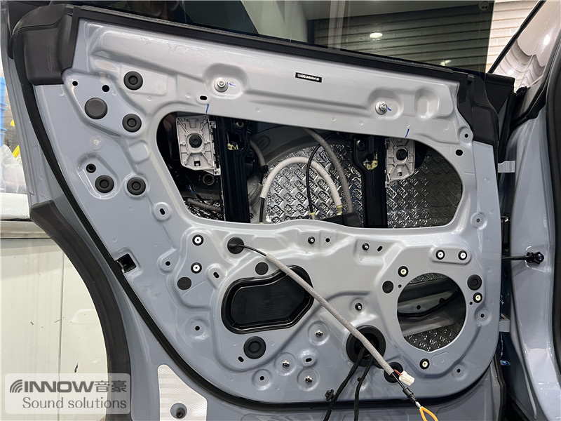 经过检测,技师发现原车的噪声主要有两种,第一种是外界传入的风噪;第二种是路噪和胎噪。因此技师使用欧洲环保隔音CTK,对汽车的门板和四轮翼子板,做了针对性的隔音处理。