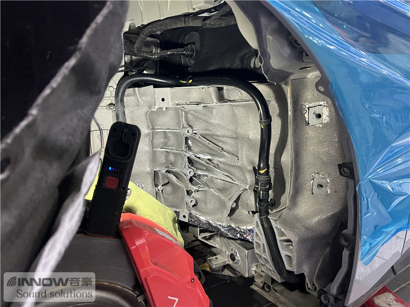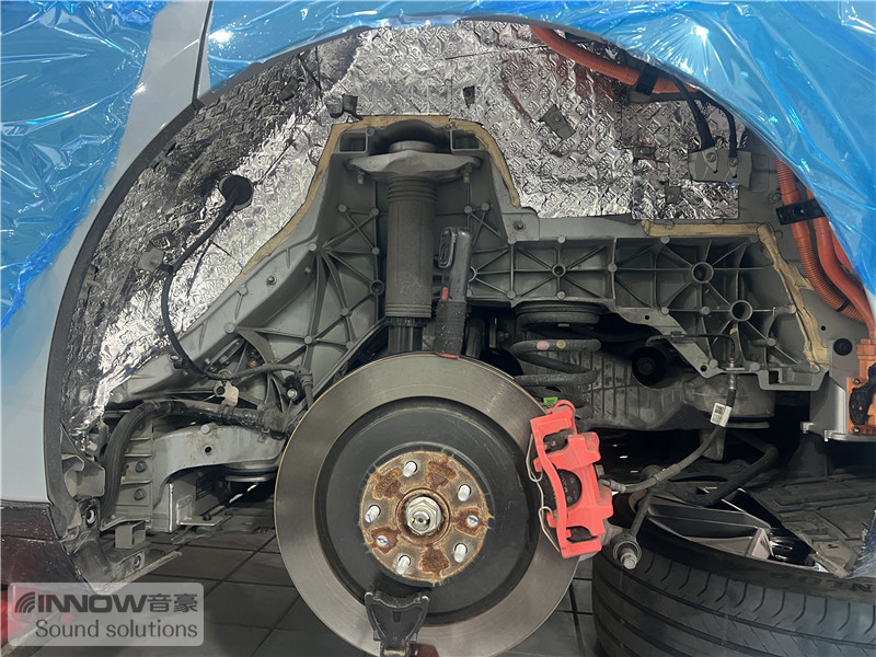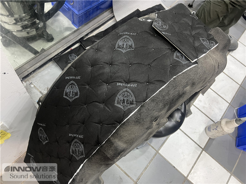 轮胎与地面摩擦会产生路噪和胎噪,此类噪声主要通过四轮翼子板传入到车厢内部。技师先使用欧铂止震板对四轮翼子板做止振处理,减少钣金振动的产生;再使用smart棉做隔音处理,增强该部位的密封性;而翼子板内衬,技师则使用战斧棉做吸音处理,多层的施工,阻止了大部分路噪和胎噪的传入。