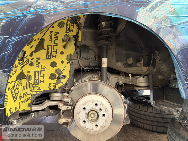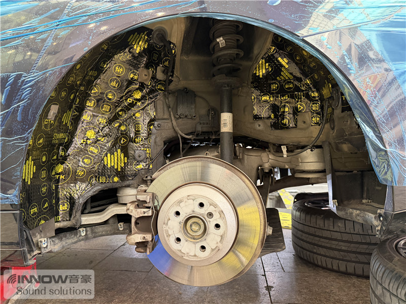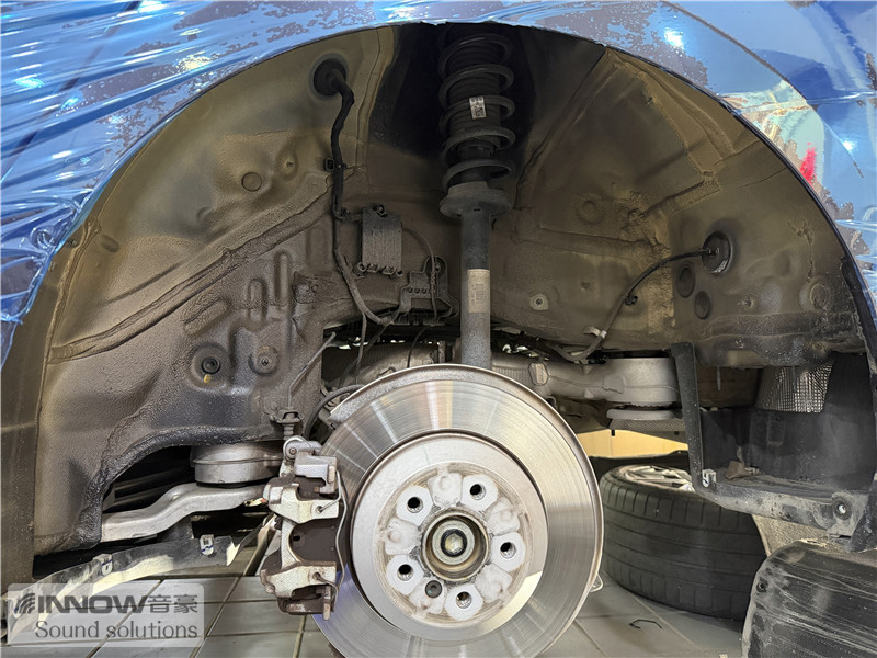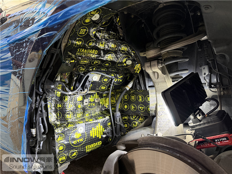 经过检测,技师发现原车的噪声主要为路噪和胎噪,这种类型的噪声会随着车速的提高而变得越来越大,因此技师使用欧洲环保隔音CTK,对汽车的四轮翼子板,做了针对性的隔音处理。