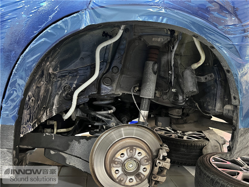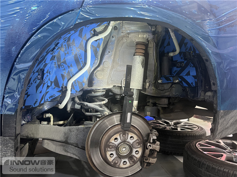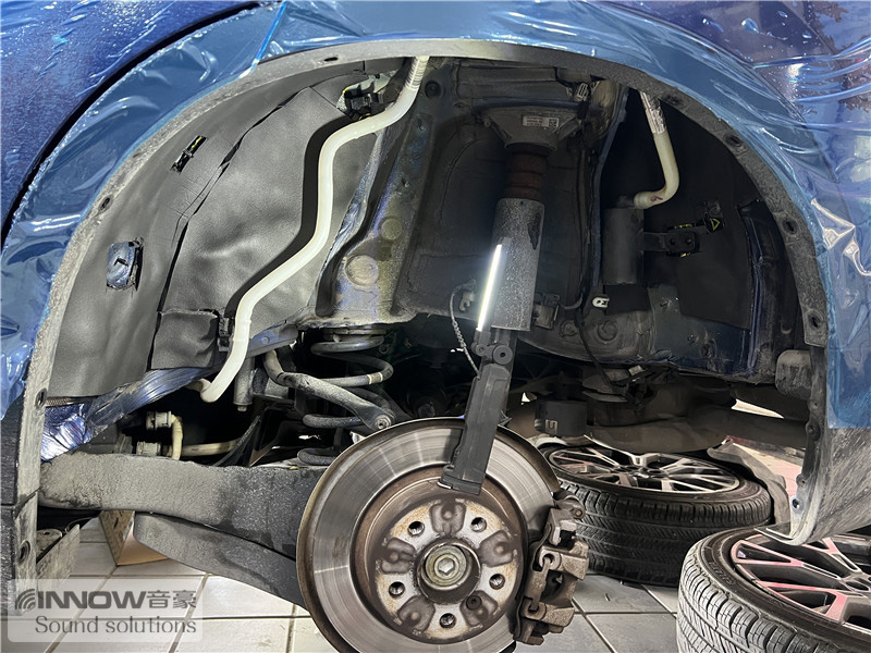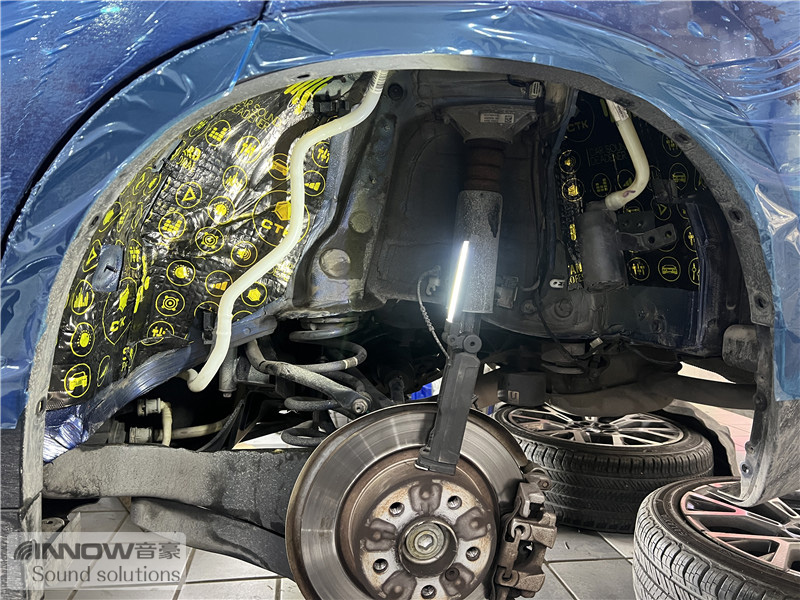 轮胎与地面摩擦难免会产生路噪和胎噪,此类噪声主要通过四轮翼子板传入到车厢内部。技师先使用欧标止震板对四轮翼子板做止振处理,减少钣金振动的产生;再使用弹力棉对该部位做吸音处理;最后使用低频王隔音棉做隔音处理,这就切断了路噪和胎噪的传入路径,将此类噪声阻挡在了车厢之外。