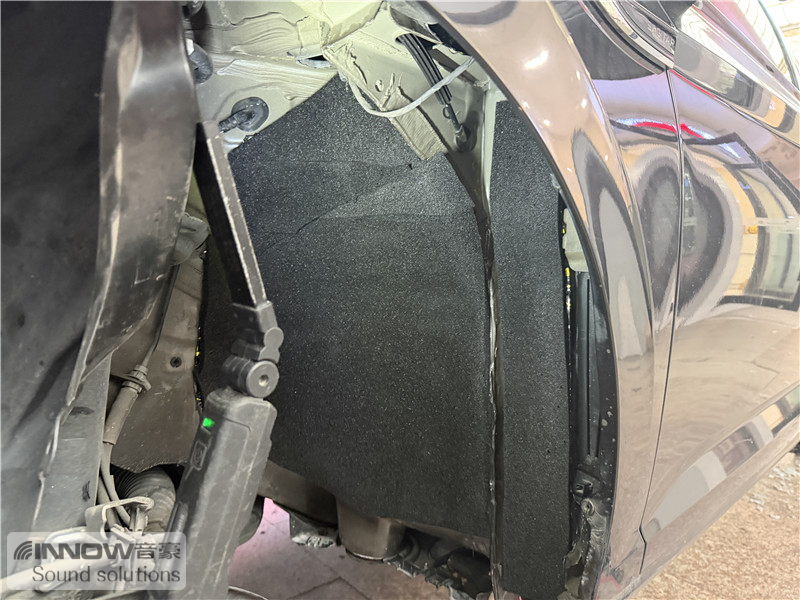 原车翼子板处只是光秃秃的铁皮结构,汽车行驶过程当中产生的路噪和胎噪非常容易传入到车厢内部。技师先使用欧标止震板对四轮翼子板做止振处理,减少钣金振动的产生;再使用黑色线性棉对四轮翼子板做吸音处理,将路噪和胎噪进行吸收,让隔音效果更加理想。