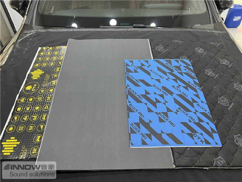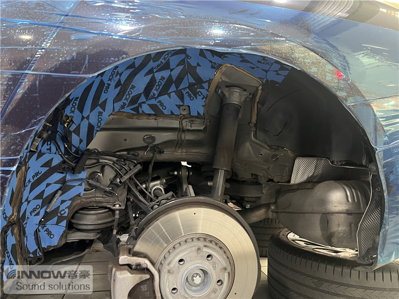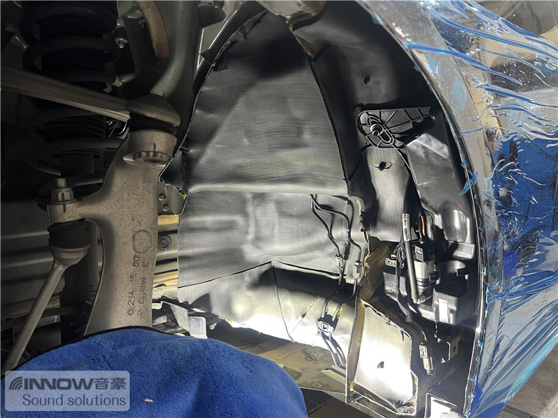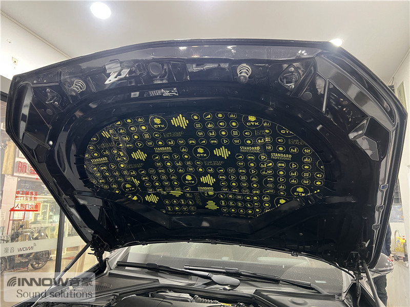 经过道路实测,技师发现原车的噪声主要有两类,第一类是路噪和胎噪;第二类则是引擎盖部位的噪声,因此技师使用 欧洲环保隔音CTK,对四轮翼子板和引擎盖,做了针对性的隔音处理。