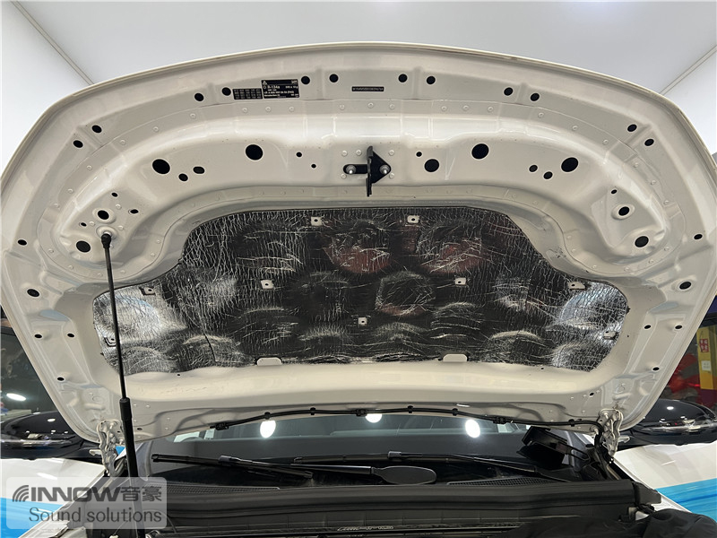 原车引擎盖只是一层铁皮结构,汽车行驶时引擎盖部位很容易产生振动噪声。所以技师先使用欧铂止震板对引擎盖做止振处理;再使用银色棉对引擎盖做吸音处理,进一步提升降噪的效果。