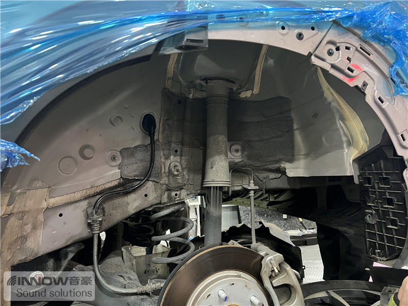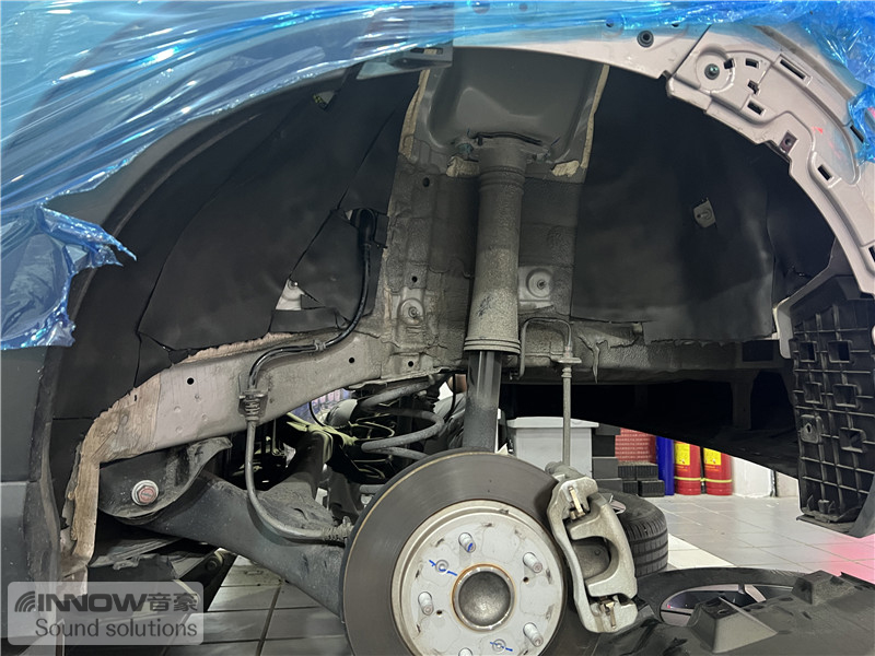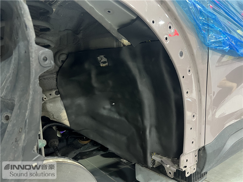 四轮翼子板是路噪和胎噪的主要传入路径,但原车在该部位并未做有效隔音处理,技师在使用欧标止震板对四轮翼子板做了止振处理后,又使用弹力棉对该部位做了吸音处理,这就切断了路噪和胎噪的传播路径,将路噪和胎噪阻挡在了车厢之外。