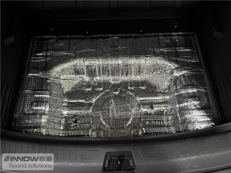 后备箱是一个空腔结构,汽车行驶时后备箱处很容易产生空腔共鸣,技师先使用欧铂止震板对后备箱做止振处理,从根源上减少低频共振的产生;再使用弹力棉对后备箱做吸音处理,以减少空腔共鸣的传播。