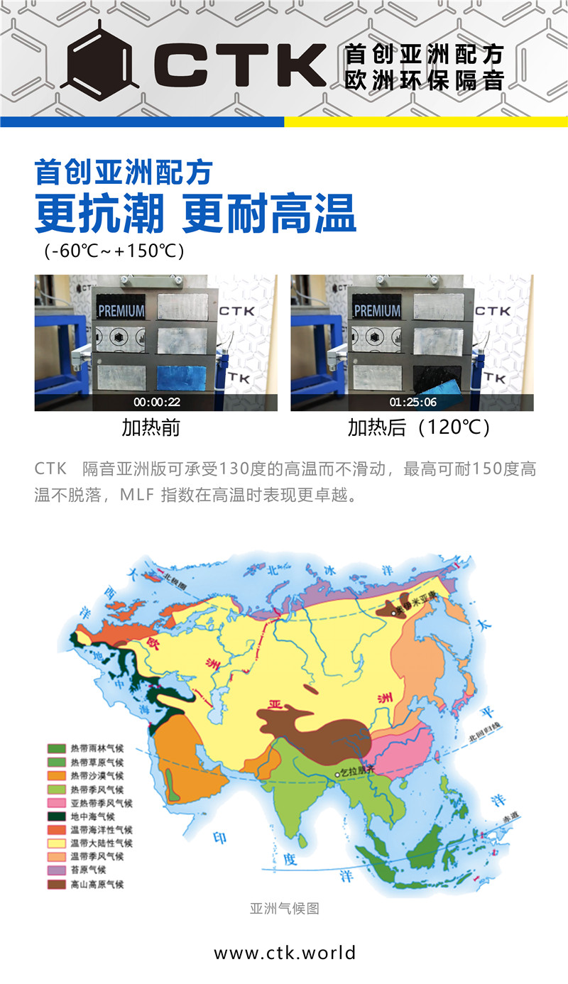 升级使用的欧洲环保隔音CTK,是一个畅销多年、多个国家的汽车专用隔音品牌,针对亚洲多变的气候环境特点,更是研发出了专门亚洲市场的配方和产品,旗下产品拥有抗潮、耐高温等特点,即便是在极热极寒等极端环境下,依然具有出众的隔音效果。