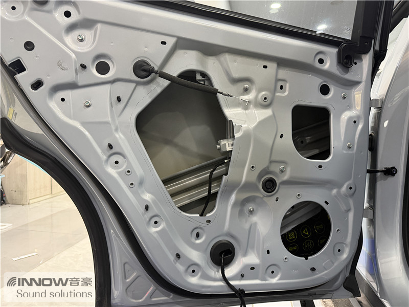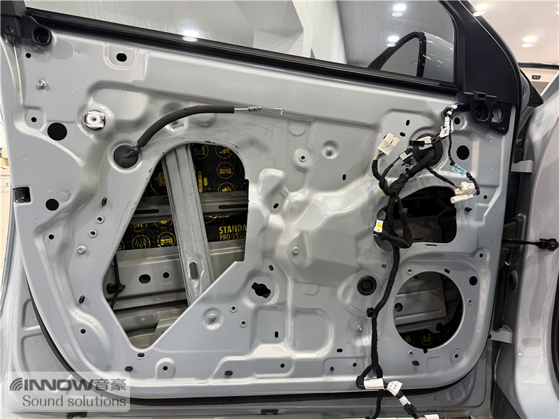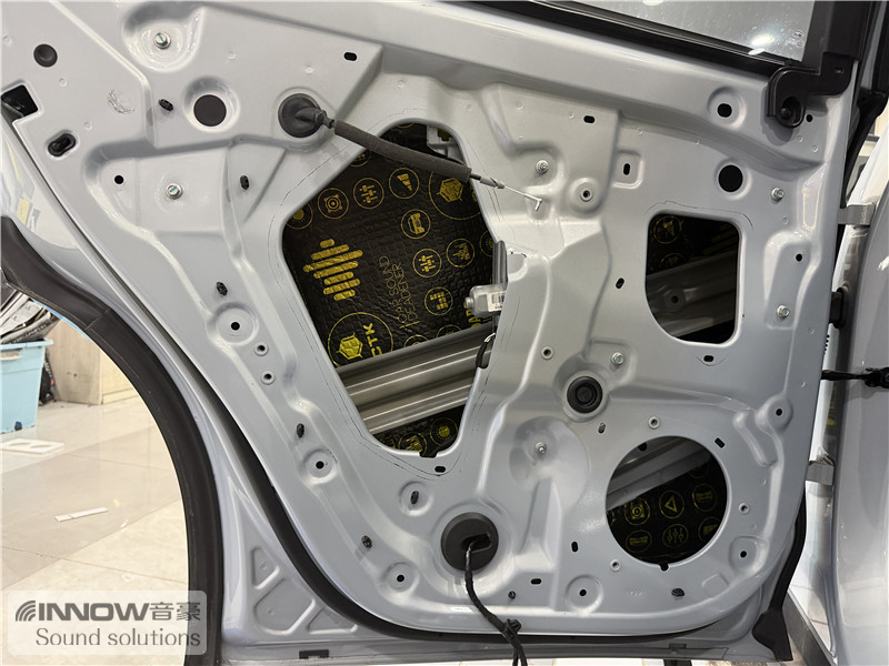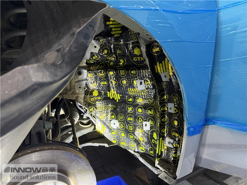 经过检测,技师发现原车的噪声主要有两大类,第一类是风噪;第二类是路噪和胎噪。这两类噪声在高速行驶时会更加明显。因此技师使用欧洲环保隔音CTK,对门板和四轮翼子板,做了针对性的隔音处理。