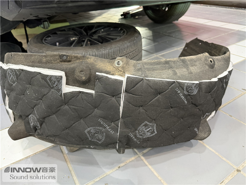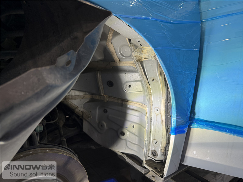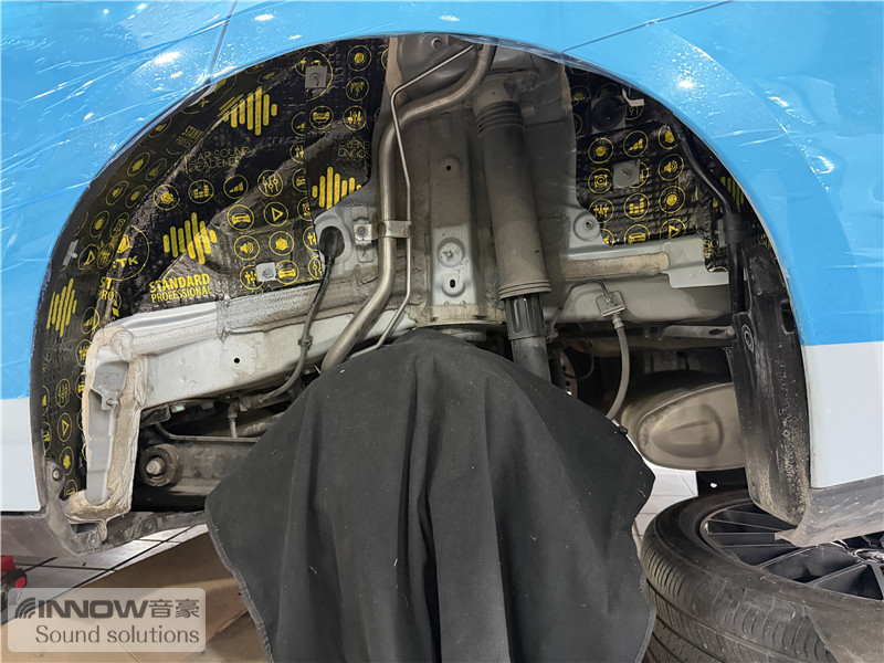 汽车行驶时产生的路噪和胎噪,主要通过四轮翼子板传入到车厢内部,技师先使用欧标止震板对四轮翼子板做止振处理,减少该部位钣金振动的产生;再使用黑色线性棉做吸音处理。而翼子板内衬,技师则使用战斧隔音棉做吸音处理,多层的施工,有效阻止了路噪和胎噪的传入。