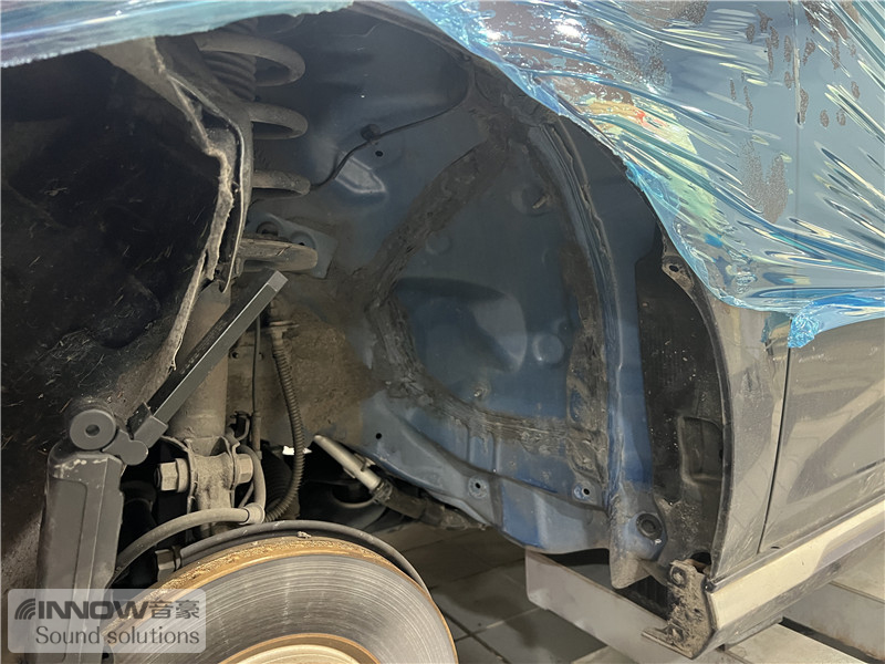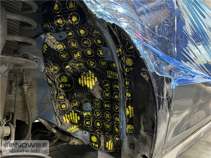 经过道路测试,技师发现原车的噪声主要为路噪和胎噪,随着车速的提升这类噪声也会随之变大,因此技师使用欧洲环保隔音CTK,对汽车的四轮翼子板做了针对性的隔音处理。