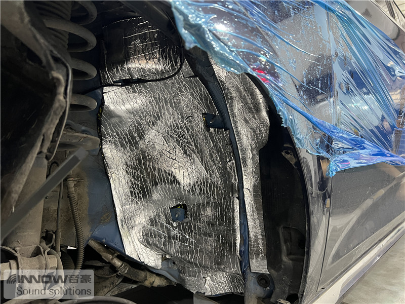 轮胎与地面摩擦会产生路噪和胎噪,此类噪声会通过四轮翼子板传入到车厢内部。技师先使用欧标止震板对四轮翼子板做止振处理,减少该部位钣金振动的产生;再使用弹力棉做吸音处理,相当隔断了噪声的传入路径;最后使用低频王做进一步的处理,充分保证隔音的效果。