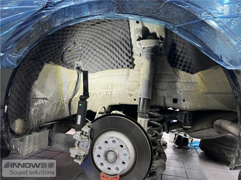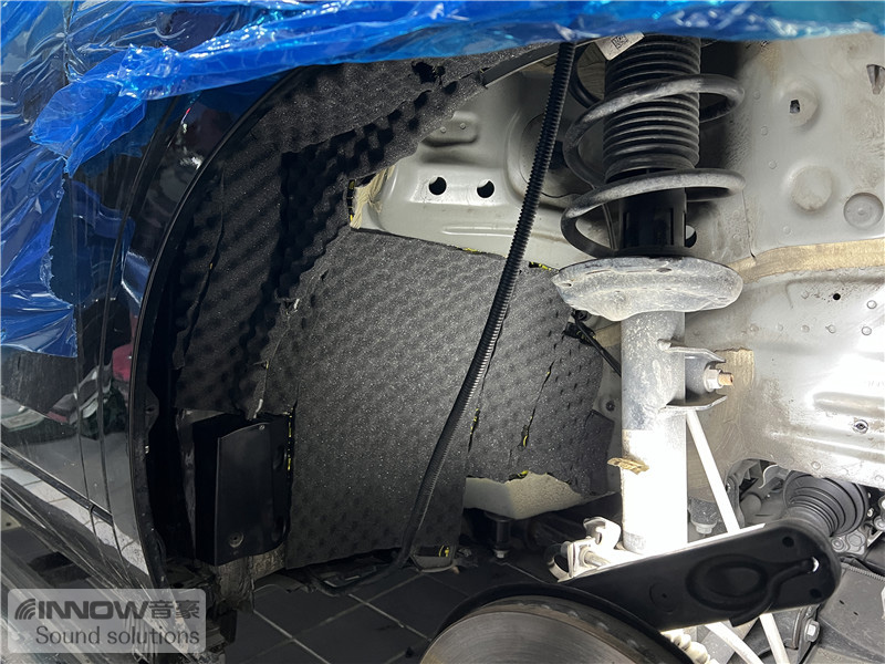 轮胎与地面摩擦会产生路噪和胎噪,这些噪声会通过四轮翼子板传入到车厢内部。技师先使用欧标止震板对四轮翼子板做止振处理,以减少该部位钣金振动的产生;再使用波浪棉对四轮翼子板做吸音处理,将路噪和胎噪进行吸收,双层的施工,阻止了大部分路噪和胎噪的传入。
