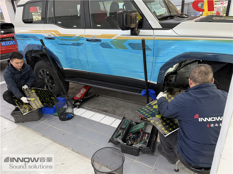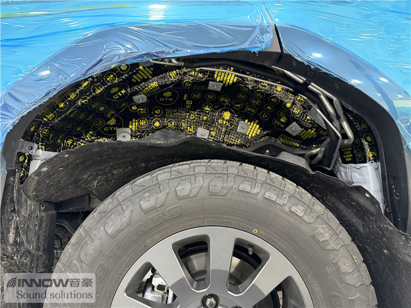 轮胎与地面摩擦会产生路噪和胎噪,此类噪声主要通过四轮翼子板传入到车厢内部。技师先使用欧标止震板对四轮翼子板做止振处理,减少该部位的振动噪声;再使用声学汉堡5.5对四轮翼子板做隔音处理,增强该部位的密封性,双层的隔音处理,阻止了大部分路噪和胎噪的传入。