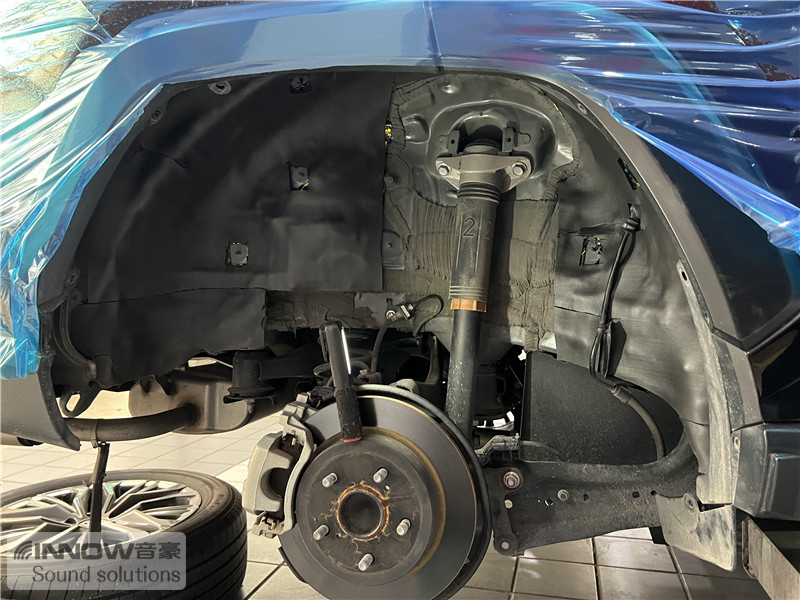 汽车行驶时会产生路噪和胎噪,此类噪声主要通过四轮翼子板传入到车厢内部。技师先使用欧标止震板对四轮翼子板做止振处理,它的丁基胶部位采用了更好的物料,铝箔厚度也做到了100μm,可以很好的减少翼子板处的钣金振动;在此基础上使用弹力棉做吸音处理,将路噪和胎噪进行吸收,充分保证隔音的效果。