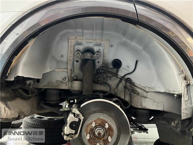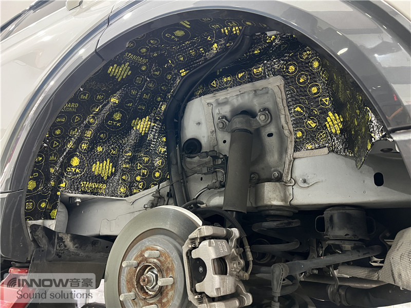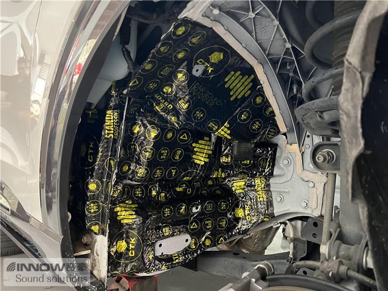 轮胎与地面摩擦会产生路噪和胎噪,此类噪声主要通过四轮翼子板传入到车厢内部。技师先使用欧标止震板对四轮翼子板做止振处理,减少钣金振动的产生;再使用弹力棉做隔音处理,增强该部位的密封性;最后使用防水吸音棉做吸音处理,将路噪和胎噪进一步吸收,让隔音效果更加理想。