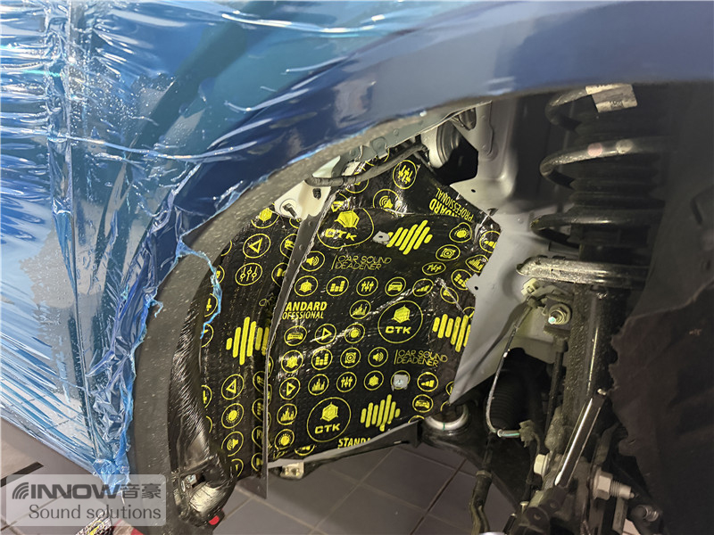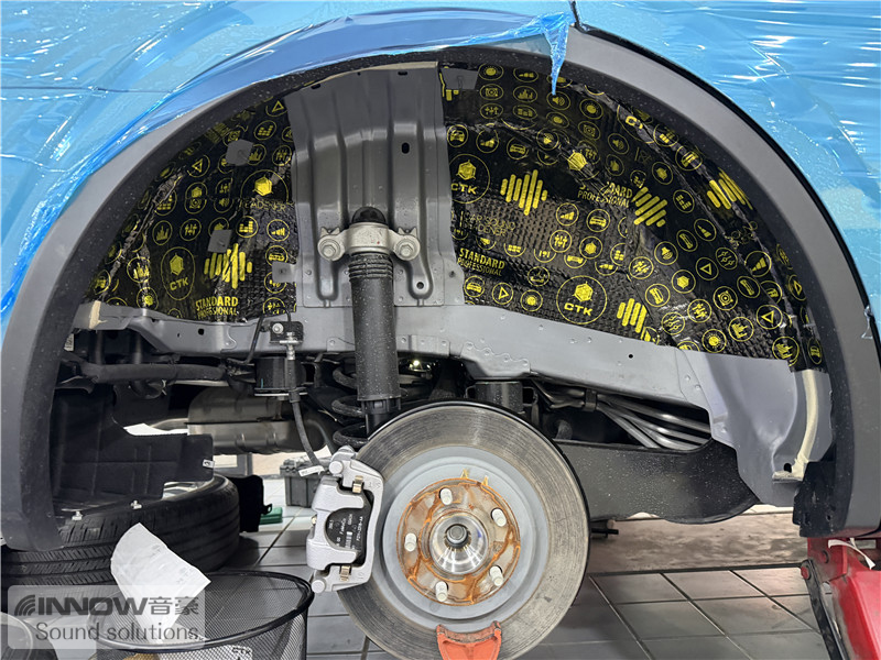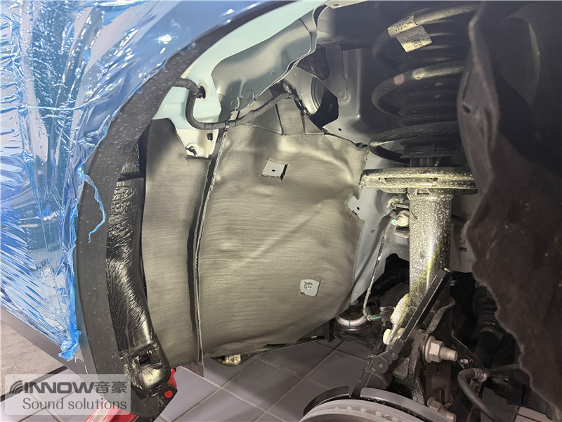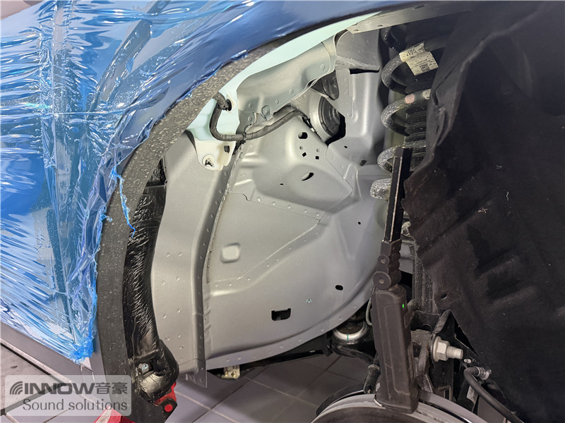 原车翼子板处未做任何有效隔音处理,导致路噪和胎噪可以轻松传入到车厢内部。技师先使用欧标止震板对四轮翼子板做止振处理,减少该部位钣金振动的产生;再使用弹力棉对四轮翼子板做吸音处理,将路噪和胎噪进行吸收,充分保证隔音的效果。