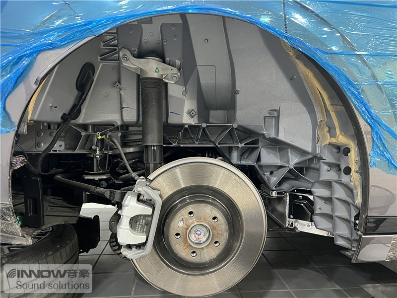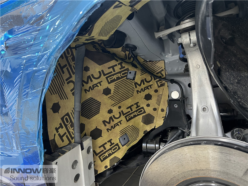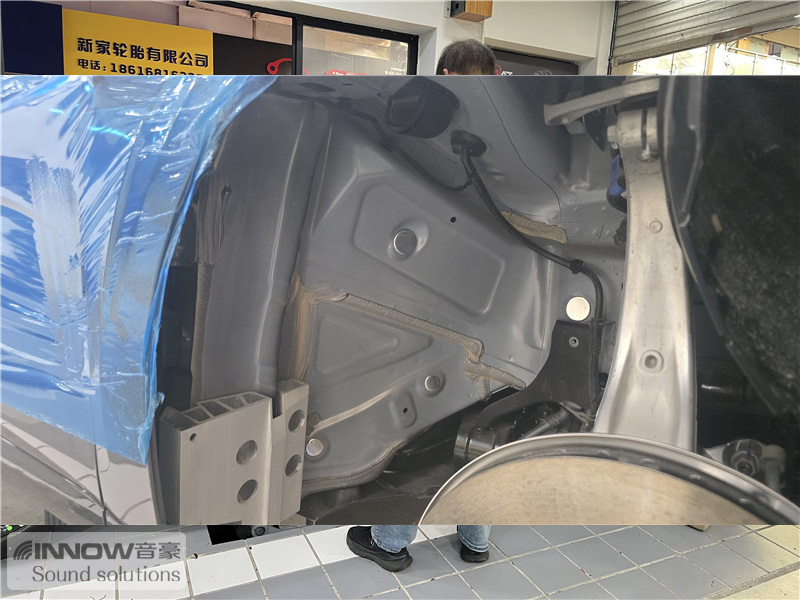 经过道路测试,技师发现原车的噪声主要以路噪和胎噪,在高速行驶时这种噪声会更加的明显。因此技师使用欧洲环保隔音CTK,对汽车的四轮翼子板做了针对性的隔音处理。