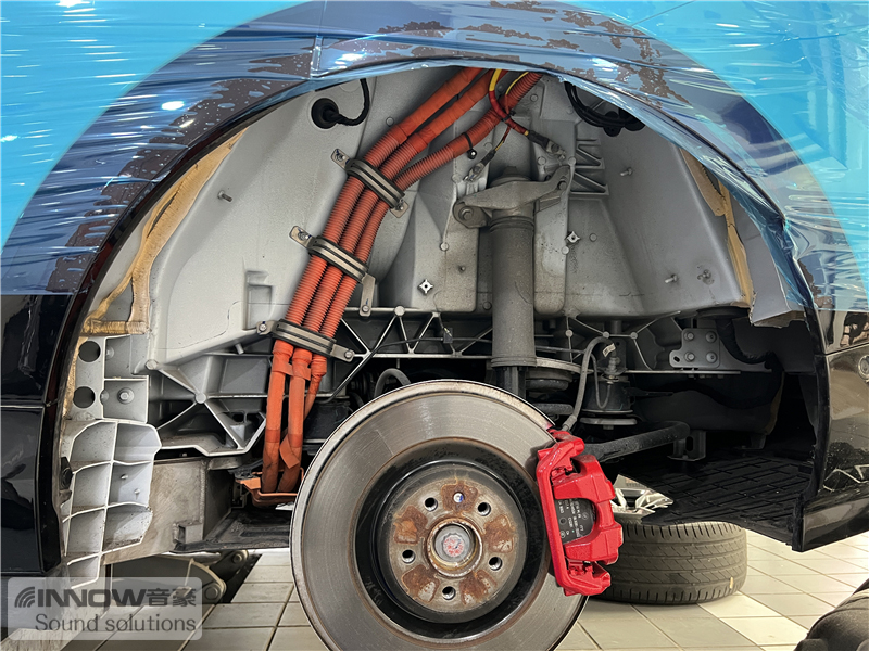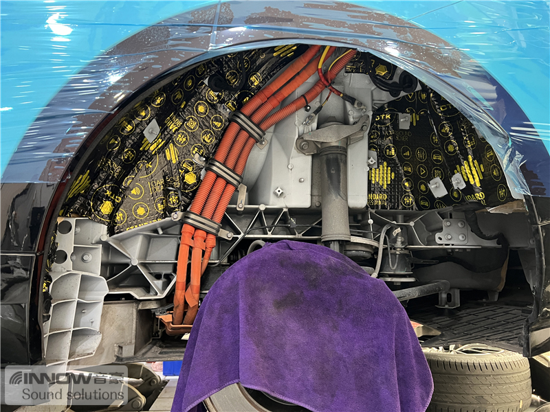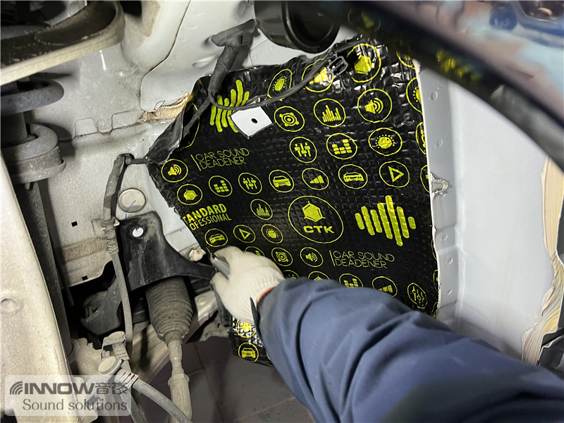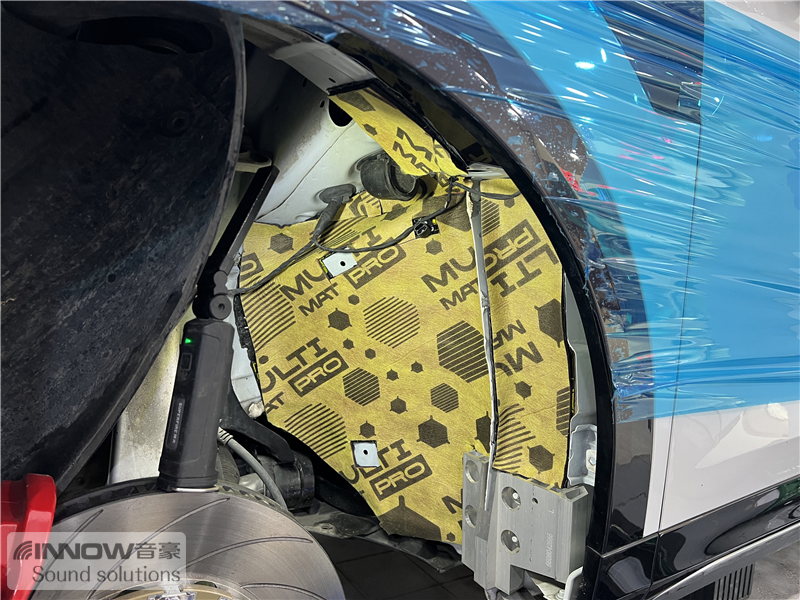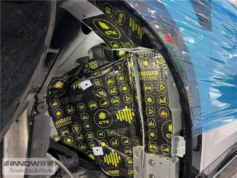 在对汽车做了道路实测后技师发现,原车的噪声主要以路噪和胎噪为主,这类噪声会随着车速的提升而变得越来越大,因此技师使用欧洲环保隔音CTK,对汽车的前轮、后轮翼子板,做了针对性的隔音处理。