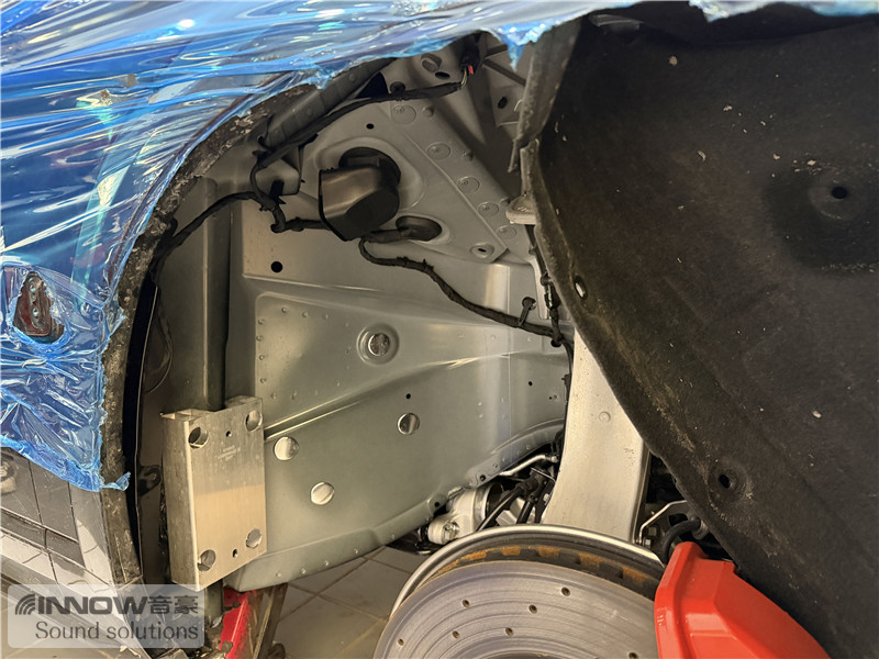 轮胎与地面摩擦会产生路噪和胎噪,此类噪声主要通过四轮翼子板传入到车厢内部。技师先使用欧尊止震板对四轮翼子板做止振处理,减少钣金振动的产生;再使用声学汉堡5.5对该部位做隔音处理。双层的隔音处理,将路噪和胎噪阻挡在了车厢之外。