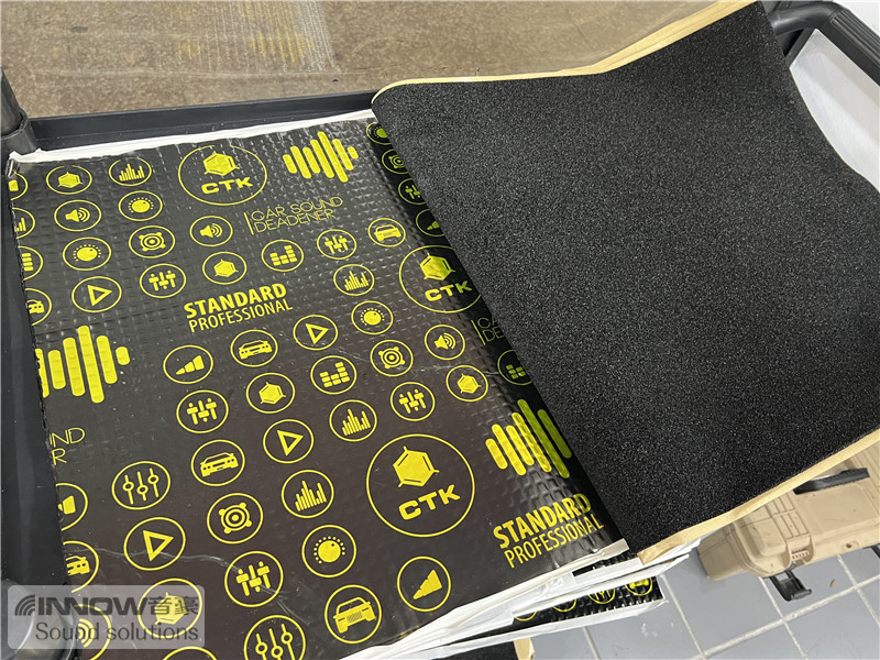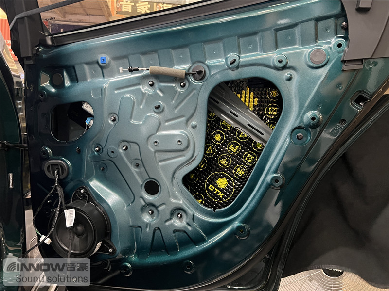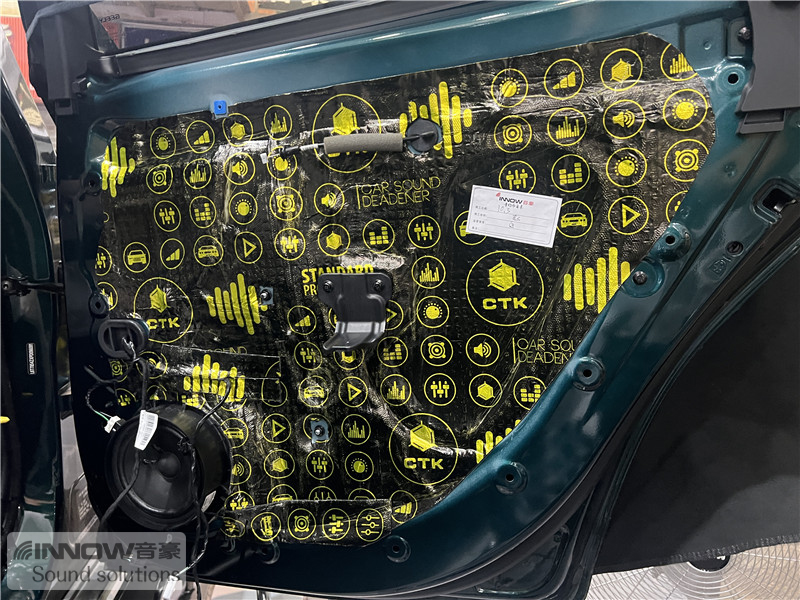 经过道路实测,技师发现原车噪声主要有两种,第一种是风噪,第二种是路噪和胎噪,因此技师使用欧洲环保隔音CTK,对汽车的门板和四轮翼子板等部位,做了针对性的隔音处理。