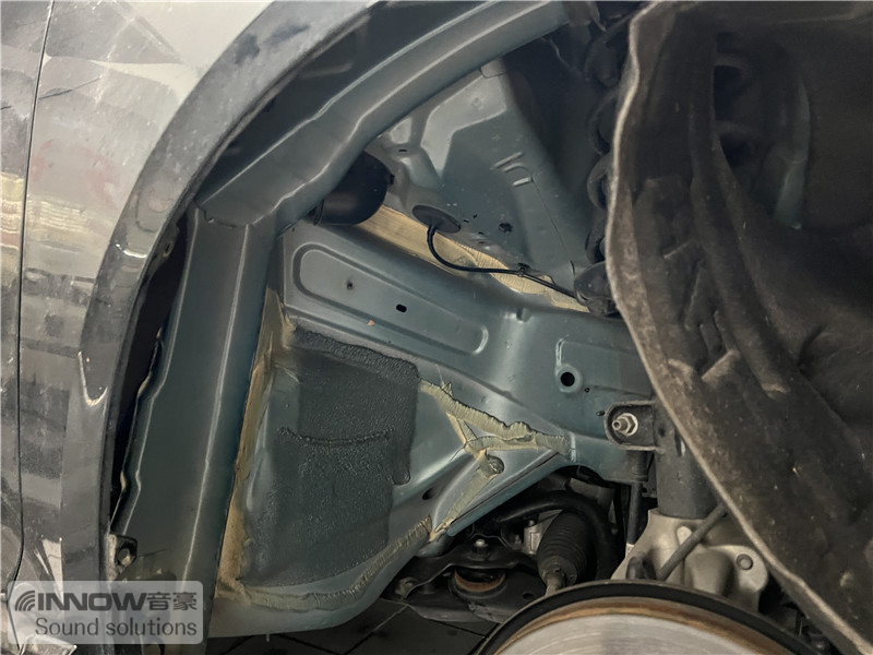轮胎与地面摩擦会产生路噪和胎噪,此类噪声会通过四轮翼子板传入到车厢内部。技师先使用欧标止震板对四轮翼子板做止振处理,减少钣金振动的产生,并增强翼子板处的密封性;再使用线性棉对四轮翼子板做吸音处理,将路噪和胎噪进行吸收,让隔音效果更加理想。