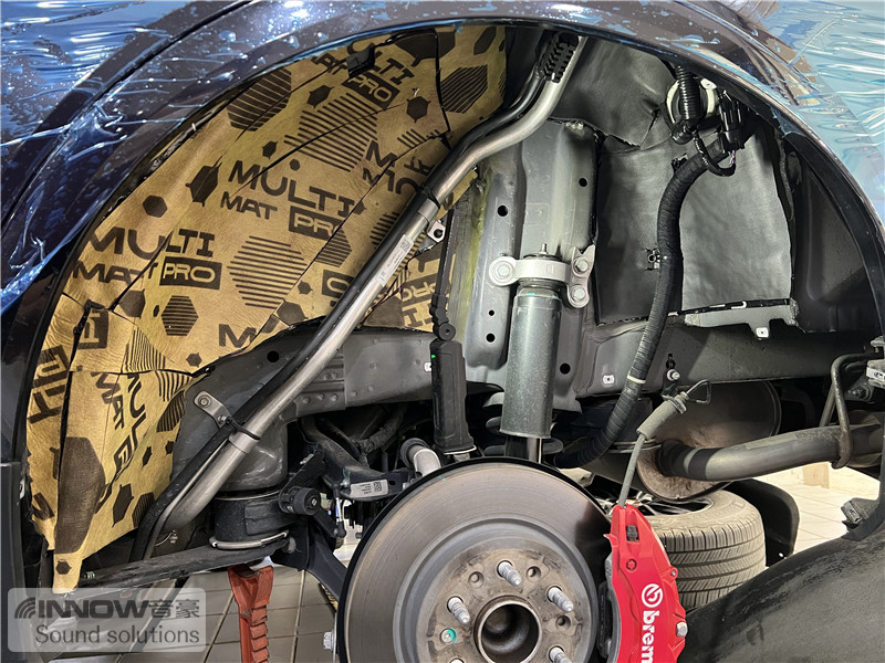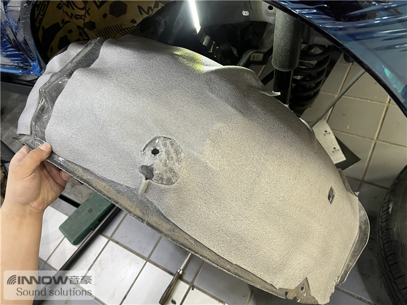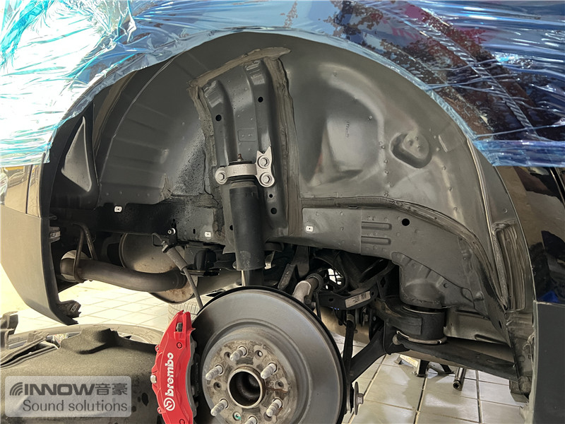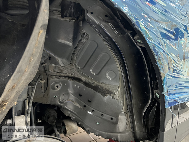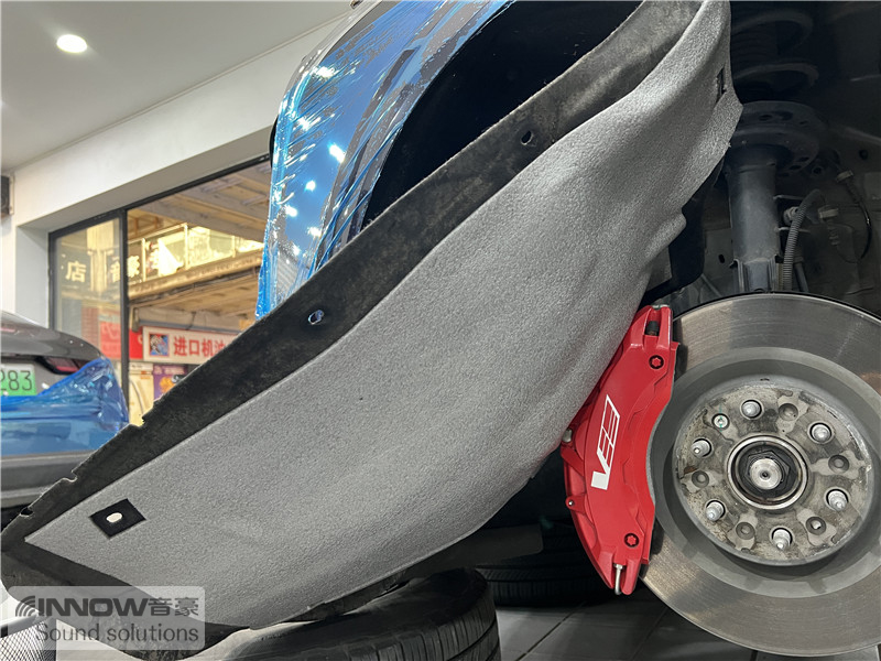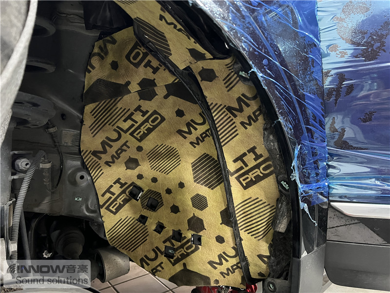 轮胎与地面摩擦产生的路噪和胎噪,主要通过四轮翼子板传入到车厢内部。技师先使用欧尊止震板对四轮翼子板做止振处理,减少钣金振动的产生;再使用声学汉堡PRO对四轮翼子板做隔音处理,减少噪声的传播;最后使用smart棉做吸音处理,多层的施工,将路噪和胎噪阻挡在了车厢之外。