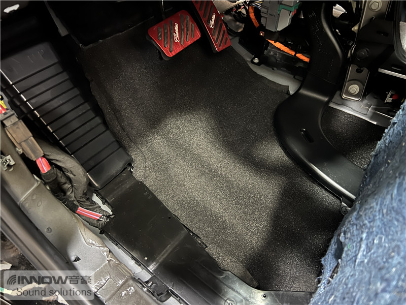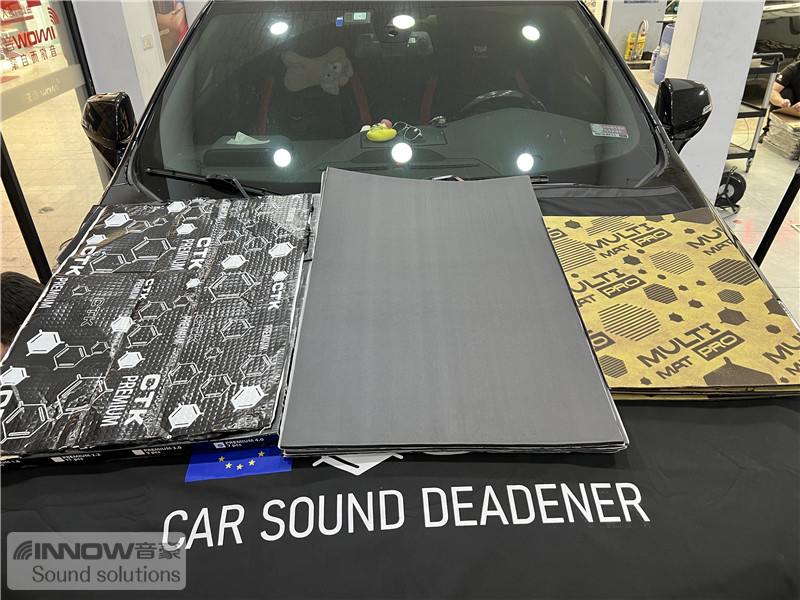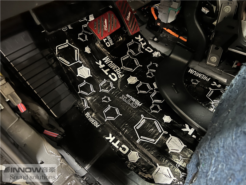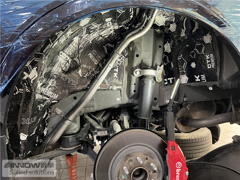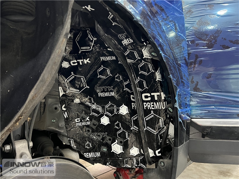 经过道路测试,技师发现原车的噪声既有发动机舱噪声,也有外界传入进来的路噪和胎噪,因此技师使用欧洲环保隔音CTK,对汽车的引擎盖、仪表台下方和四轮翼子板,做了针对性的隔音处理。