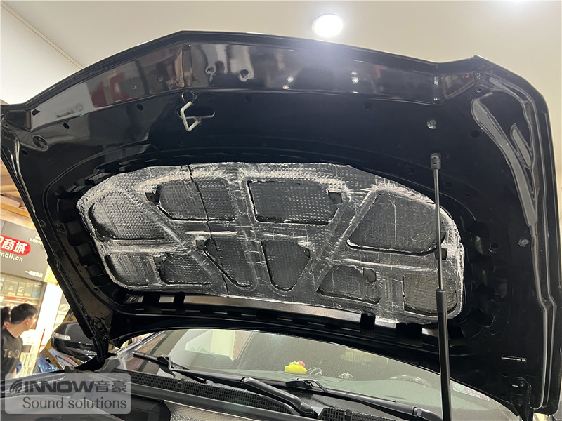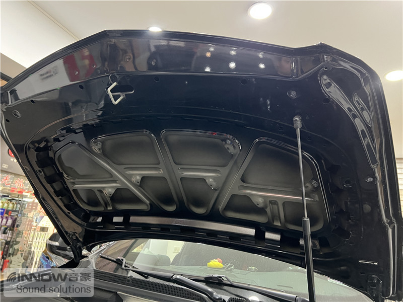 打开引擎盖以后可以看到,原车引擎盖只是一层铁皮结构,并未做有效隔音处理,汽车行驶时引擎盖部位会产生振动噪声,技师使用欧铂止震板对引擎盖做止振处理,减少该部位振动噪声的产生。
