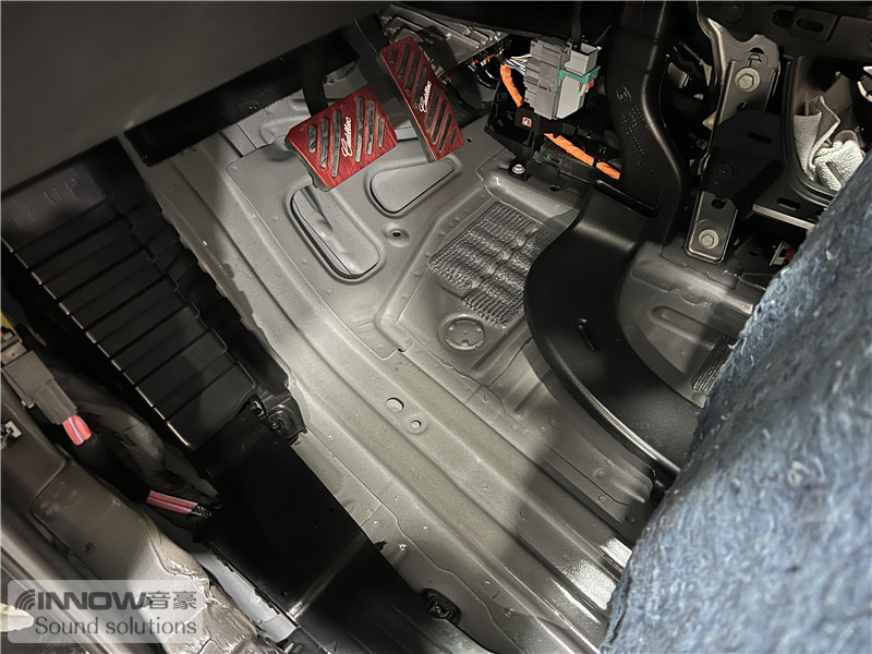 汽车行驶时发动机舱内会产生各种各样的噪声,这些噪声会通过仪表台下方传入到车厢内部。技师在使用欧尊止震板对仪表台下方做了止振处理后,又使用吸音棉对仪表台下方做了吸音处理,有效阻止了发动机舱内各类噪声的传入。