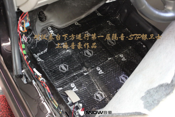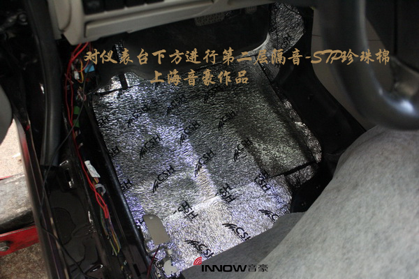 当路噪入侵到仪表台下方时会引发共振,从而产生共振噪音。于是上海音豪的改装技师使用俄罗斯stp航空系列的stp银卫士对仪表台下方进行第一层止振隔音处理,可以减少低频共振噪音的产生;然后使用STP珍珠棉进行第二层的吸音处理,吸收部分低频噪音,大大加强了隔音效果。STP航空银卫士采用多层减振材料,包括聚合物薄膜层、丁基橡胶层和自粘层,具有最大化的吸音止振功能、机械损失系数少且阻燃效果好。