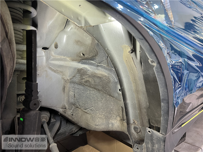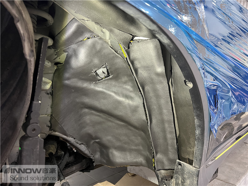 轮胎与地面摩擦会产生路噪和胎噪,这类噪声在高速时尤为明显。技师先使用欧标止震板对四轮翼子板做止振处理,既能减少钣金振动,同时还能够增强密封性;再使用弹力棉对四轮翼子板做吸音处理,将路噪和胎噪进行吸收,让隔音效果更加理想。
