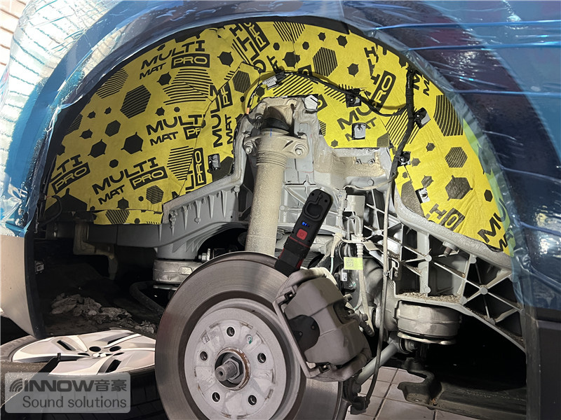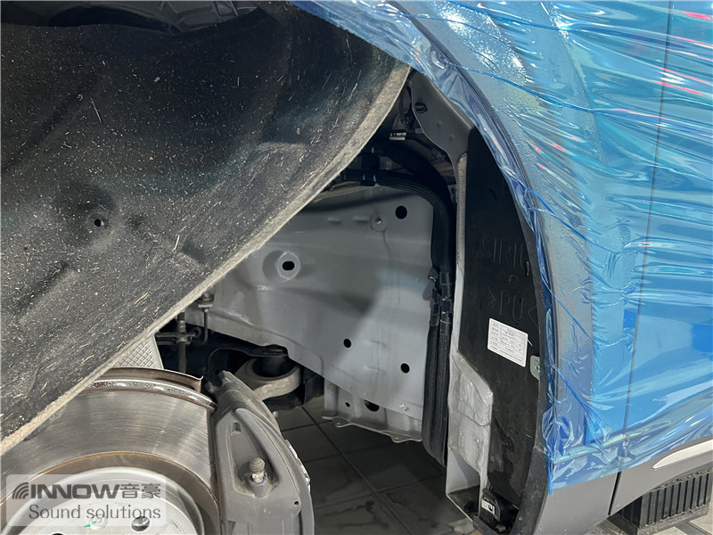 经过道路测试,技师发现原车的噪声主要为路噪和胎噪,这类噪声也是汽车行驶过程当中非常常见的一种噪声,因此技师使用欧洲环保隔音CTK,对汽车的四轮翼子板,做了针对性的隔音处理。