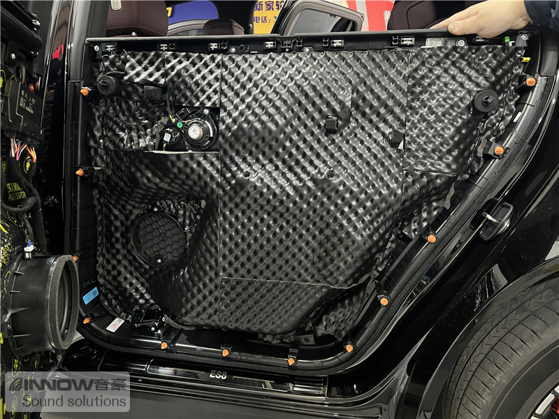 原车门板还算厚实,但是门板内部空洞结构较大,且未做有效隔音处理,风噪很容易通过门板传入到车厢内部,技师使用欧标止震板对门板做双层止振处理,而门板饰盖则使用波浪吸音棉做吸音处理,这就增强了门板处的密封性,阻止了风噪的传入。