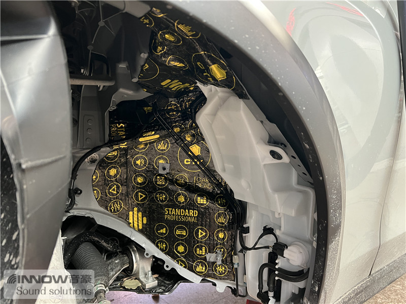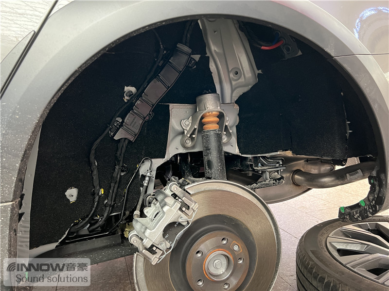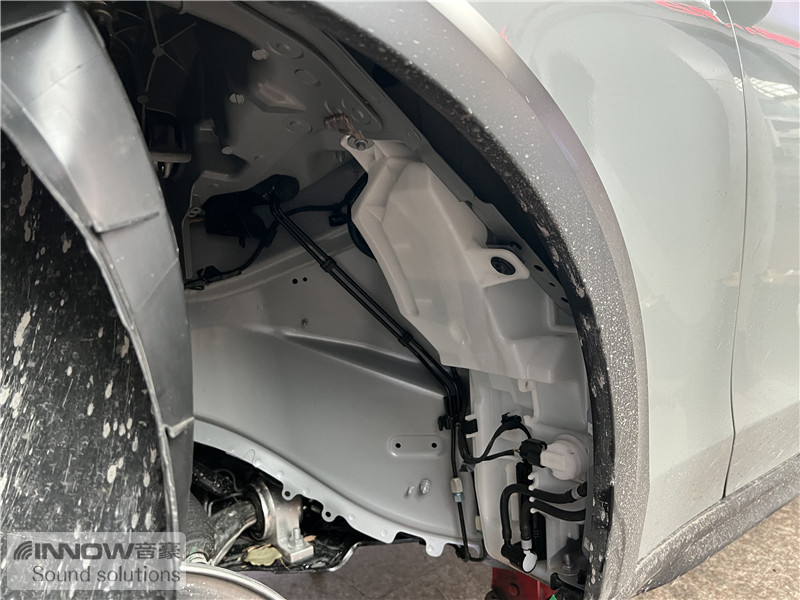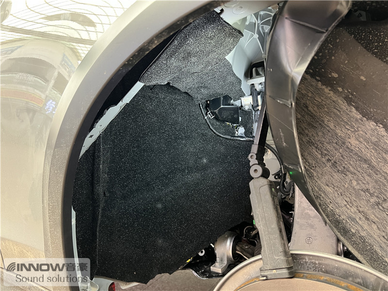 技师拆下原车翼子板内衬后发现,翼子板处没有做任何隔音措施,轮胎与地面摩擦产生的路噪和胎噪,很容易通过该部位传入到车厢内部。因此技师先使用欧标止震板对四轮翼子板做止振处理,减少该部位的钣金共振;再使用线性棉对四轮翼子板做吸音处理,从而阻止了大部分路噪和胎噪的传入。