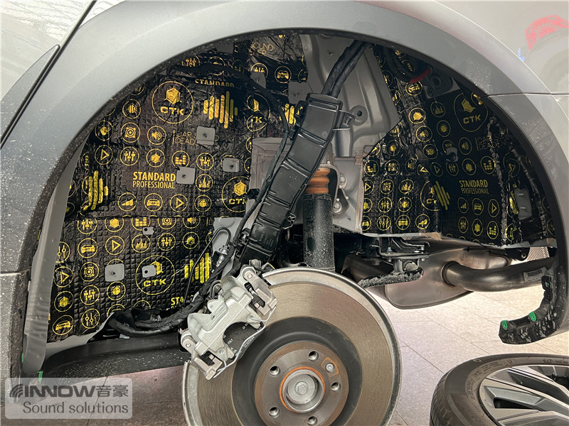 经过道路实测,技师发现车辆在行驶过程中车内噪声主要是路噪与胎噪,而且这类噪声会随着车速的提升而变大,因此技师使用欧洲环保隔音CTK隔音材料,对汽车的四轮翼子板做了针对性隔音处理。