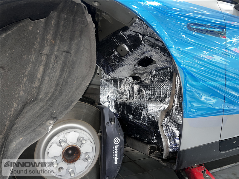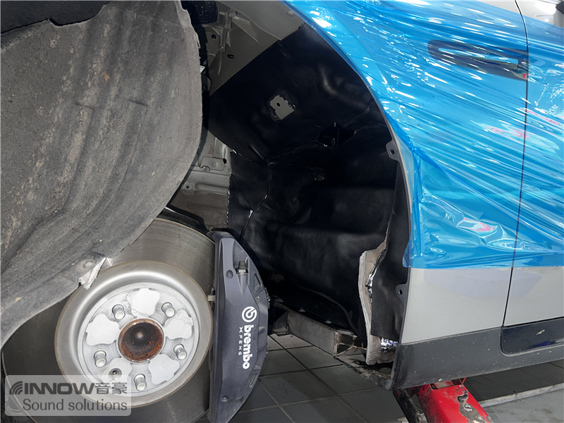 经过检测,技师发现原车的噪声主要为路噪和胎噪,这类噪声会随着车速的提升而变得越来越大。因此技师使用欧洲环保隔音CTK,对汽车的四轮翼子板,做了针对性的隔音处理。