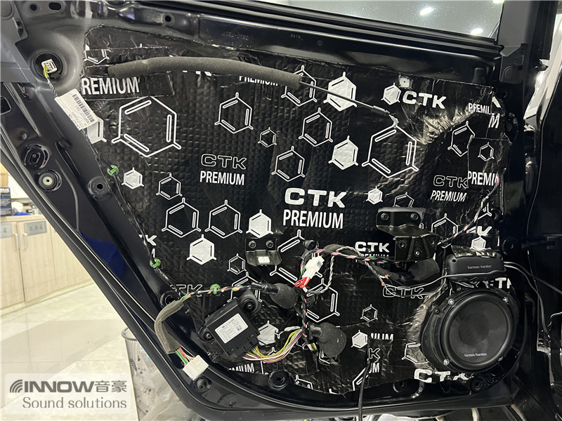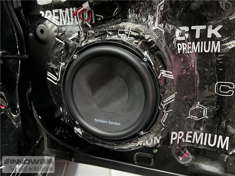 在使用欧洲环保隔音CTK 欧尊止震板,对门板做了隔音处理后,技师将前声场喇叭升级成了哈曼卡顿 FIT 6CF两分频喇叭,它的高音单元使用的是柔丝球顶高音,并采用了边缘驱动,让高频部分显得更加平滑;中低音单元使用了大音圈设计,让中低音部分更加真实饱满。